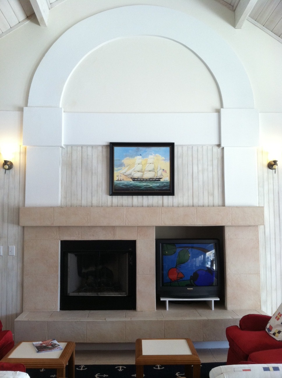 Pinkish tiled fireplace with oldddd school TV